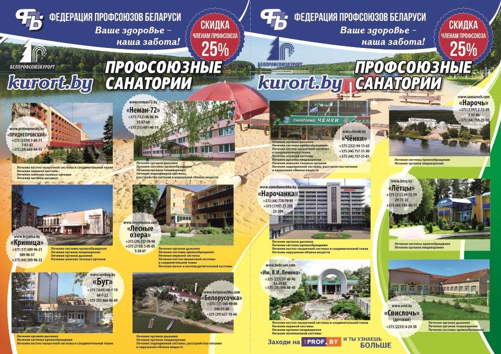 Круглогодично для членов профсоюза предоставляется скидка в размере 25% от стоимости путевки при приезде в санаторий.
