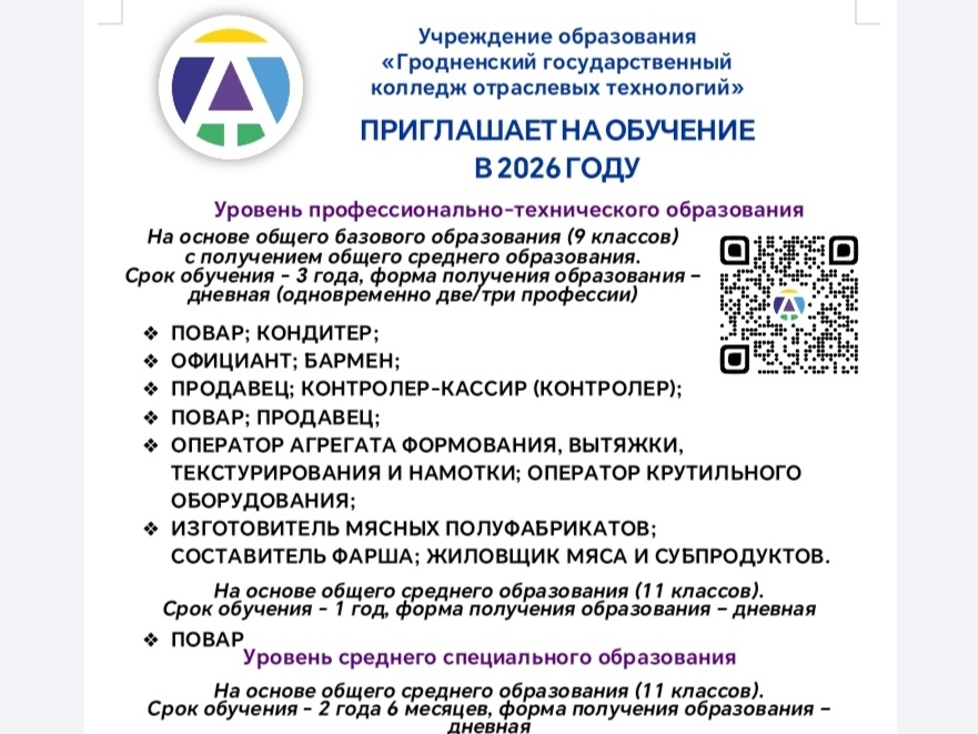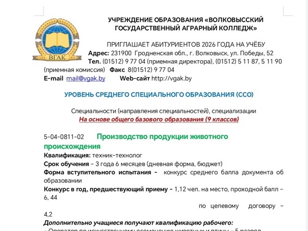 УО «Волковысский государственный аграрный колледж» приглашает стать студентом