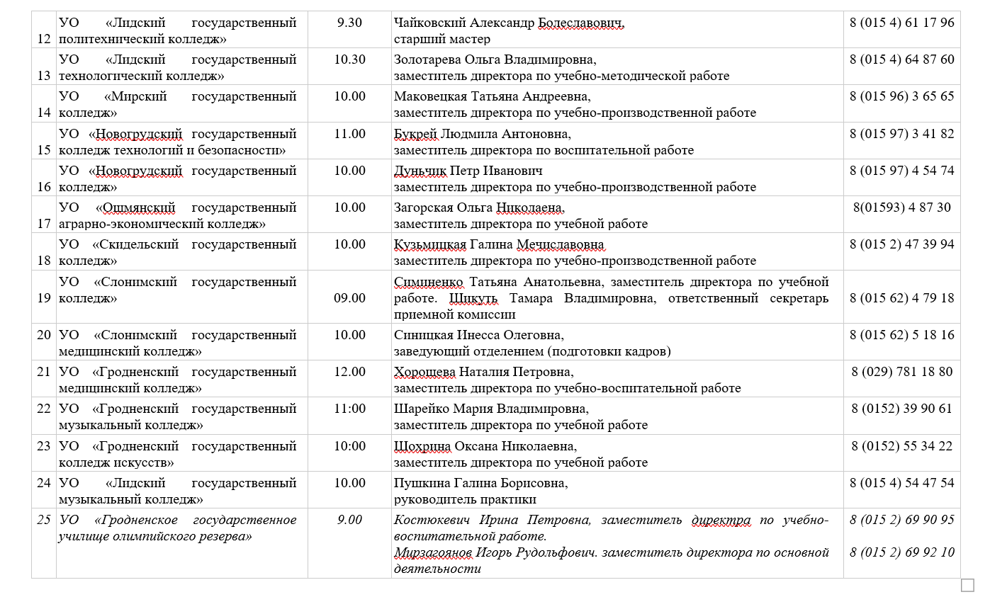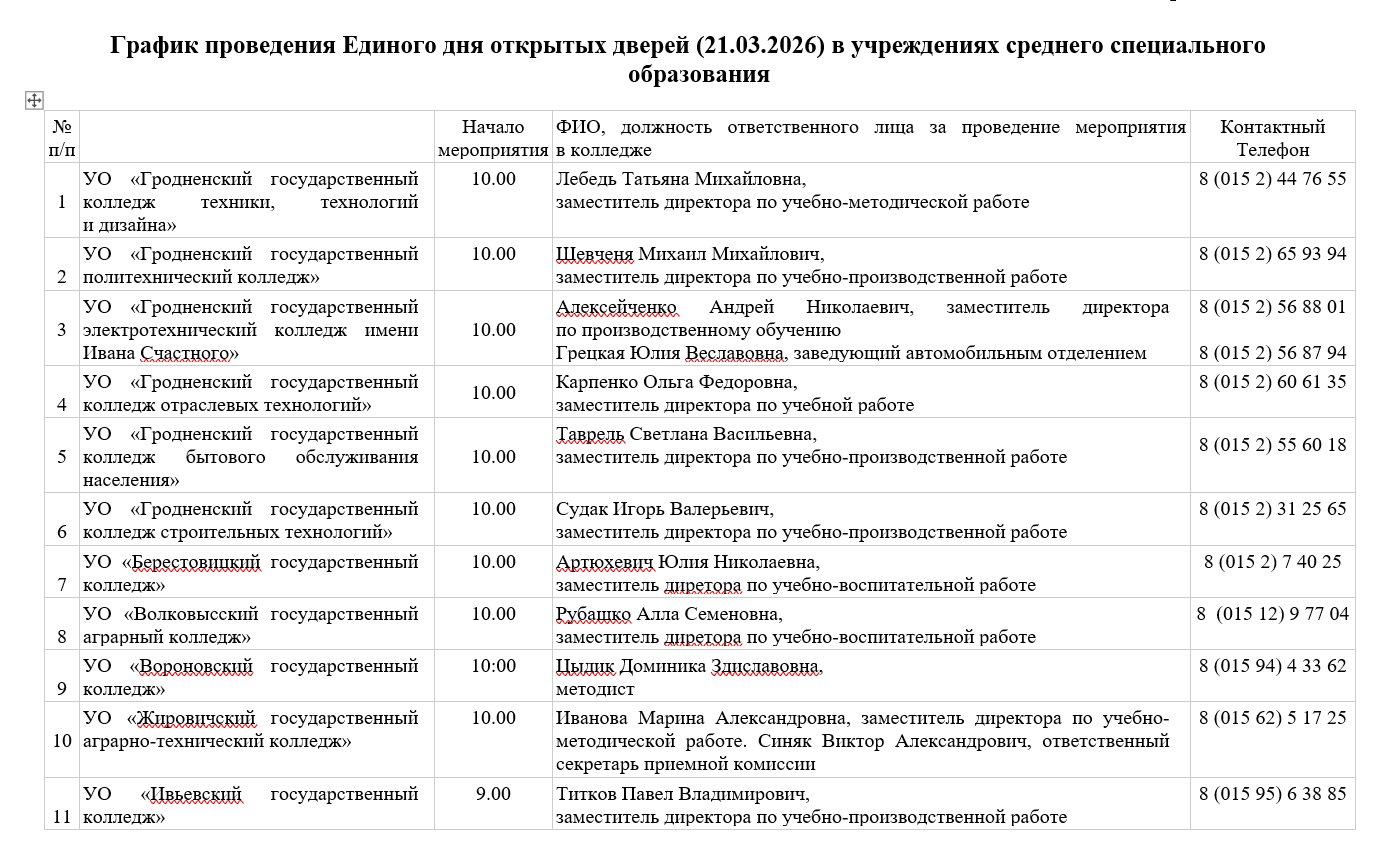 График проведения Единого дня открытых дверей (21.03.2026) в учреждениях среднего специального образования