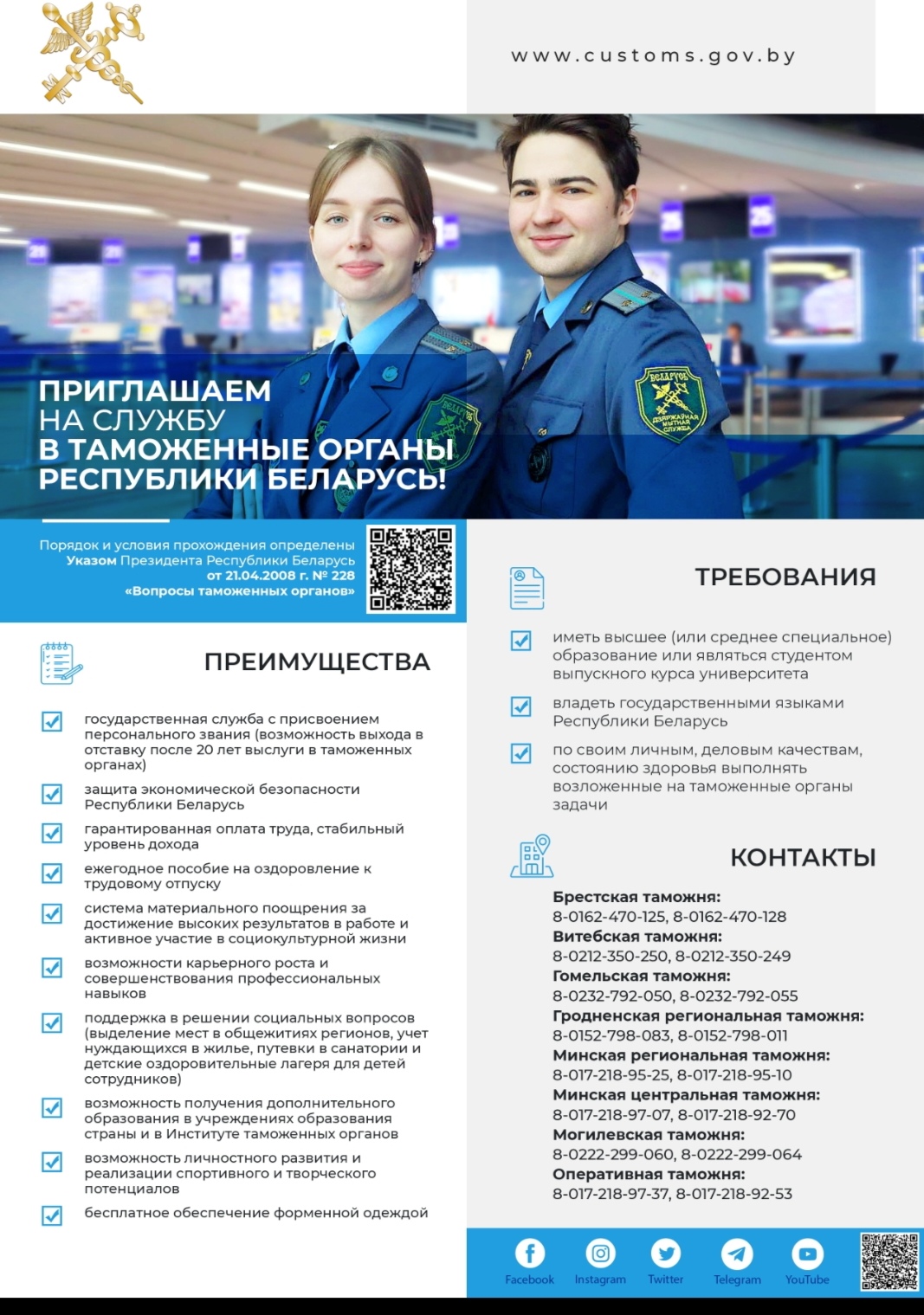 Представители таможни готовы провести встречу, в том числе on-line, с выпускниками учреждений образования, разъяснить условия прохождения службы и ответить на интересующие их вопросы, о чём необходимо уведомить заранее.