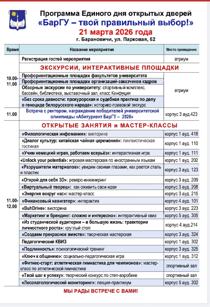 УО "Барановичский государственный университет" приглашает на день открытых дверей. 21 марта 2026 г.