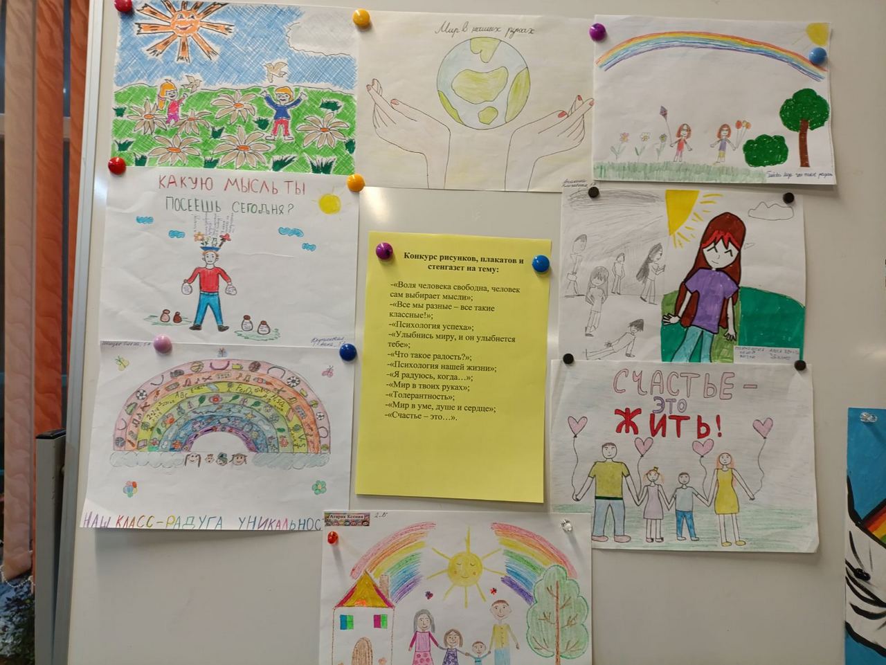Педагог - психолог Сонец С.Н. подведела итоги конкурса рисунков, плакатов и стенгазет на тему: «Воля человека свободна, человек сам выбирает мысли»; «Все мы разные – все такие классные!»; «Психология успеха»; «Улыбнись миру, и он улыбнется тебе»; «Что такое радость?»; «Психология нашей жизни»; «Я радуюсь, когда…»; «Мир в твоих руках»; «Толерантность»; «Мир в уме, душе и сердце»; «Счастье – это…» и Фоточеленджера: «Помощь и поддержка», «Мы умеем дружить», «Как я радуюсь жизни», «Мои способности». Отмечены групповые работы 3 "Б"класса в фоточеленджере, а также индивидуальные работы Полежаевой Арины "Мир в уме, душе и сердце", учащейся 7 "Б" класса, Барило Анастасии, учащейся 5 "А" класса "Мир в твоих руках", Крупинской Анны, учащейся 5 "А" класса "Какую мысль ты посеешь сегодня?", Шицко Ольги, учащейся 5 "А" класса "Наш класс- радуга уникальностей, Евхуты Алеси, учащейся 3 "Б" класса "Психология нашей жизни". Учащиеся получили сладкие угощения и психологические спиннеры "Разрешение конфликтов", "Позитивные аффирмации".