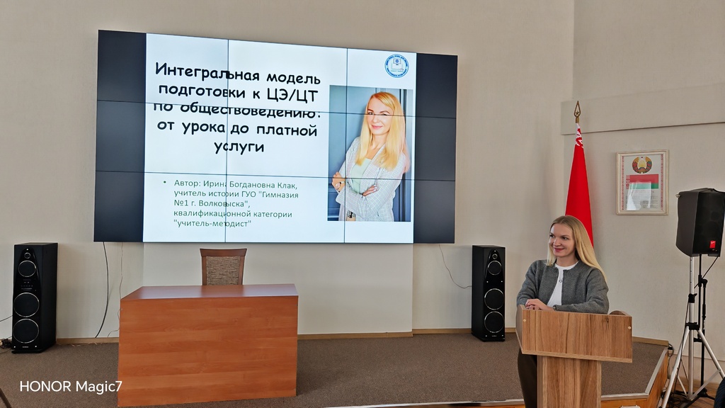 Учитель истории гимназии №1 Ирина Богдановна Клак (категория «учитель-методист») представила авторскую модель подготовки к ЦЭ по обществоведению на республиканском семинаре.