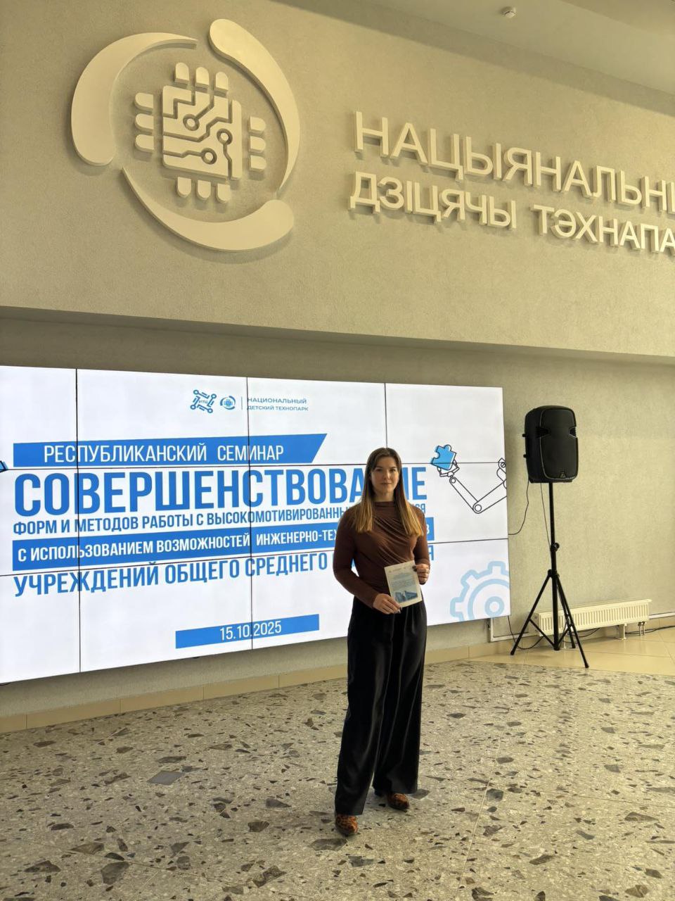 15 октября 2025 года Карпович Валентина Михайловна, учитель информатики, приняла участие в республиканском семинаре «Совершенствование форм и методов работы с высокомотивированными учащимися с использованием возможностей инженерно-технических центров учреждений общего среднего образования» в учреждении образования «Национальный детский технопарк»
