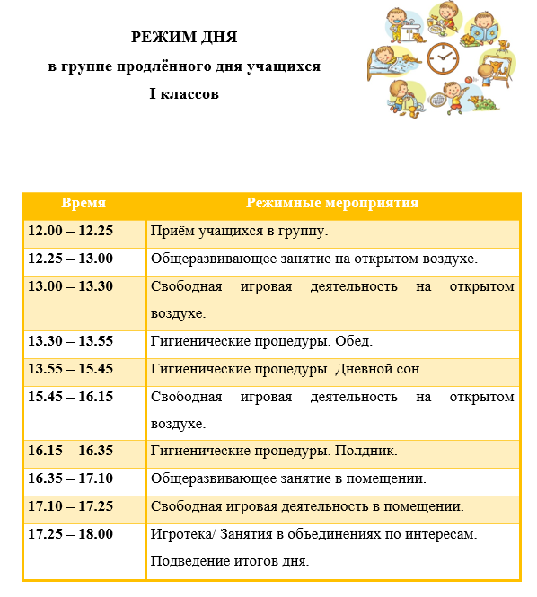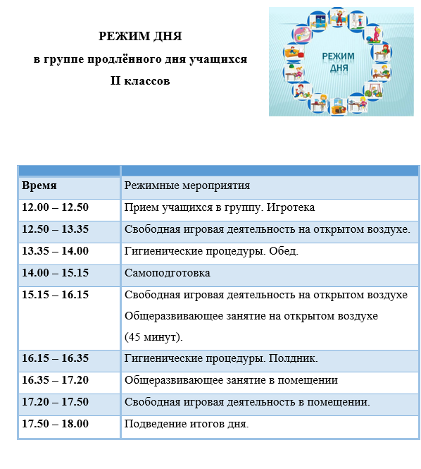 функционируют группы продлённого дня для учащихся 1-2 классов. Созданы необходимые условия для успешной реализации образовательного и воспитательного процесса в течение дня.