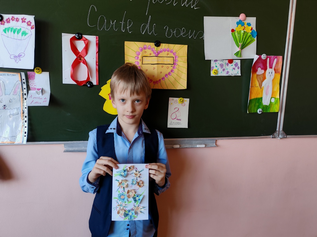 Накануне Международного женского дня у учащихся 4 "Б" класса, изучающих французский язык, прошёл конкурс на лучшую поздравительную открытку к 8 Марта. Места распределились следующим образом: 🥇1 место занимает Вероника Юргель 🎀 🥈2 место занимает Максим Савко 🎉 🥉3 место занимает Варвара Филоник 🎈 Поздравляем победителей! 👏🎉🎁🎊💐