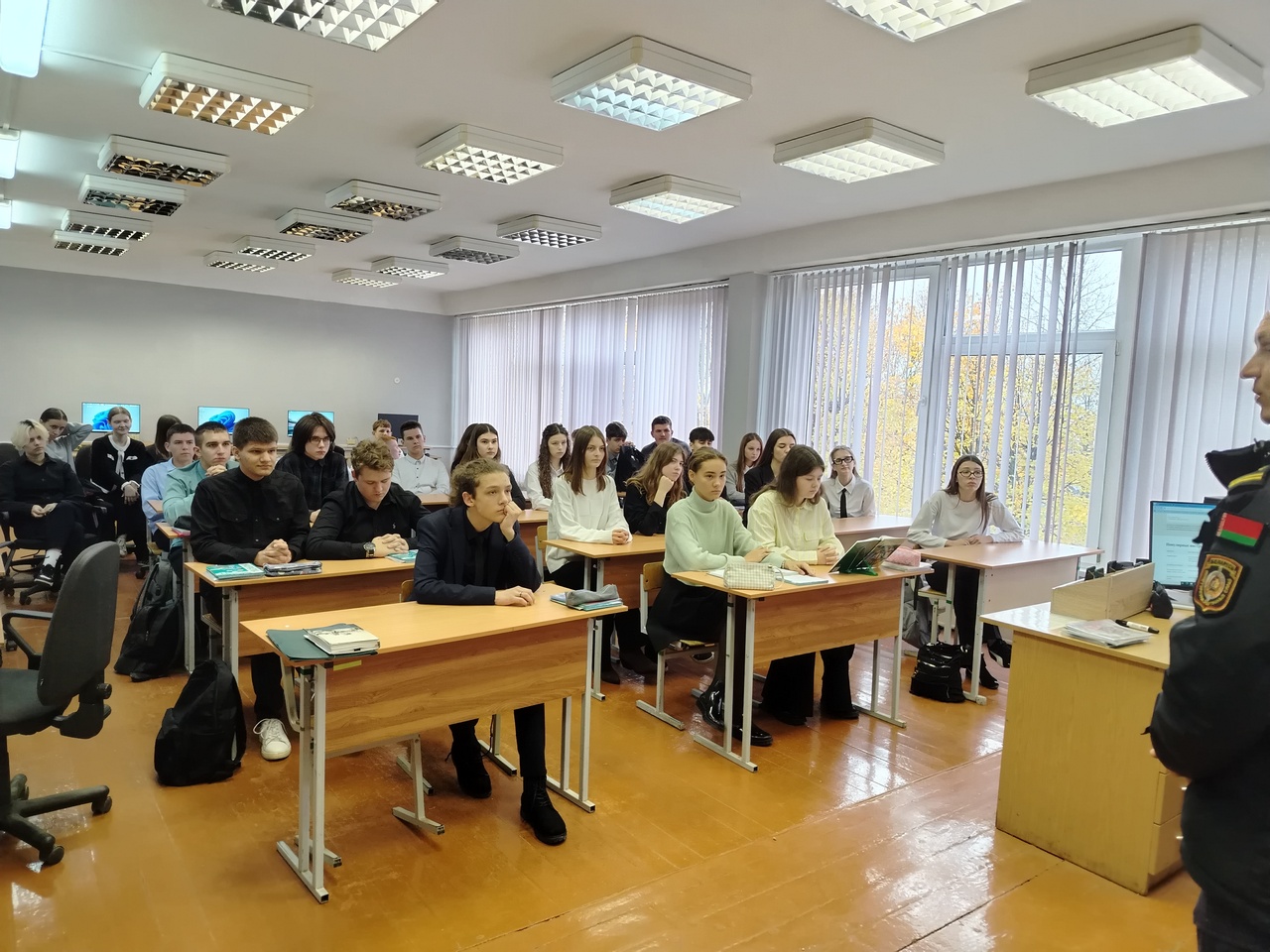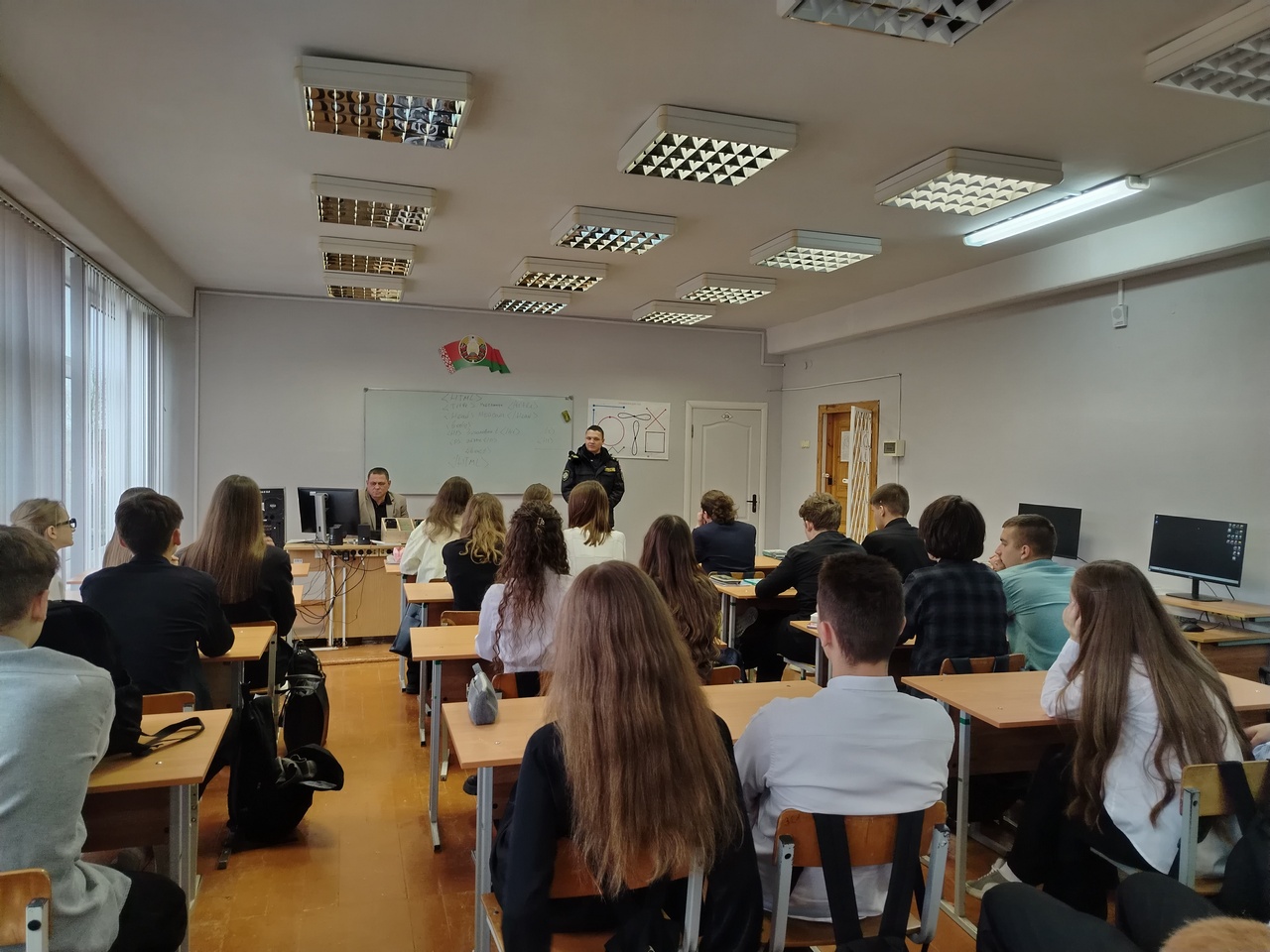 27 октября с учащимся 10-11 классов состоялась профориентационная встреча с заместитель командира роты ППСМ МОБ Центрального РУВД г. Минска майором милиции Соловьем Евгением Сергеевичем.