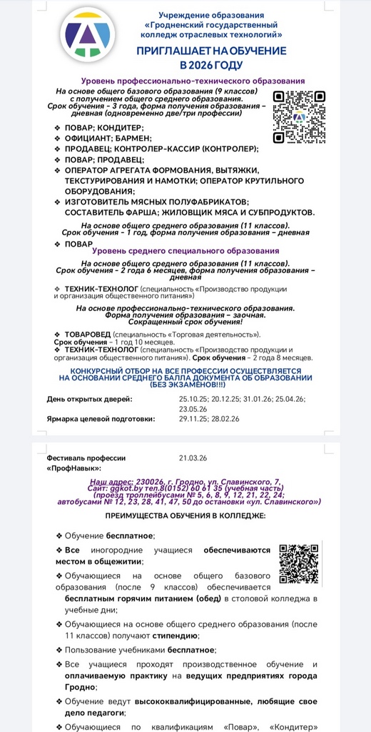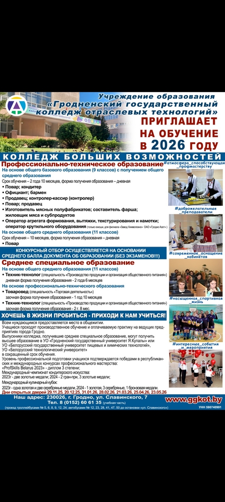 УО "Гродненский государственный колледж отраслевых технологий" приглашает на обучение в 2026 году.