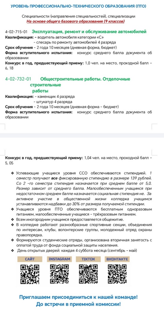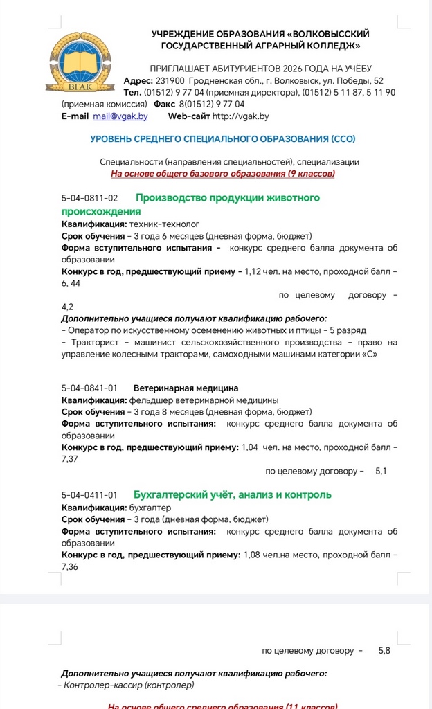 УО «Волковысский государственный аграрный колледж» приглашает стать студентом