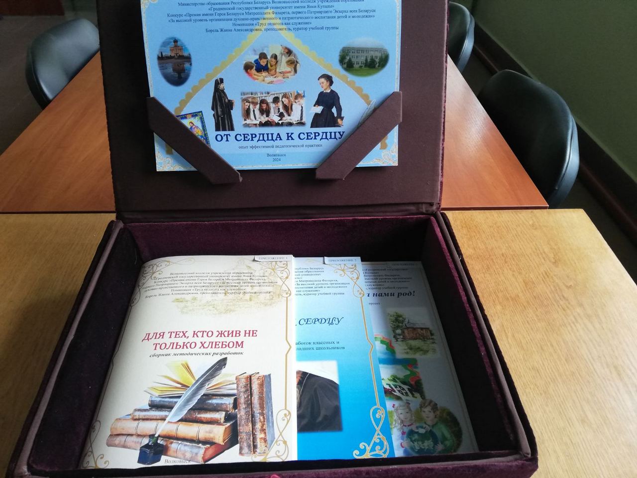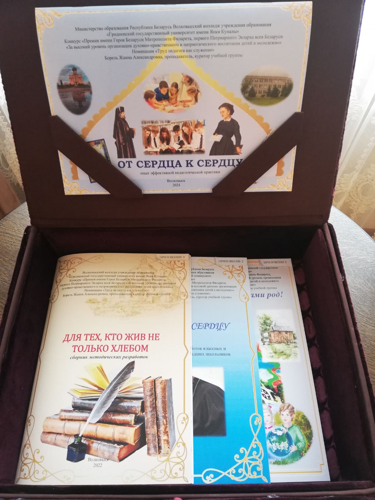 Жанна Александровна, представила опыт работы «От сердца к сердцу», который составляют три сборника: «Для тех, кто жив не только хлебом…», «От сердца к сердцу», «За нами правда! За нами род!». В них содержатся сценарии мероприятий, направленные на духовно-нравственное развитие личности учащихся, осваивающих образовательные программы профессионально-технического и среднего специального образования, обучающихся на III ступени общего среднего образования, а также опыт организации классных и информационных часов для обучающихся на I ступени общего среднего образования.