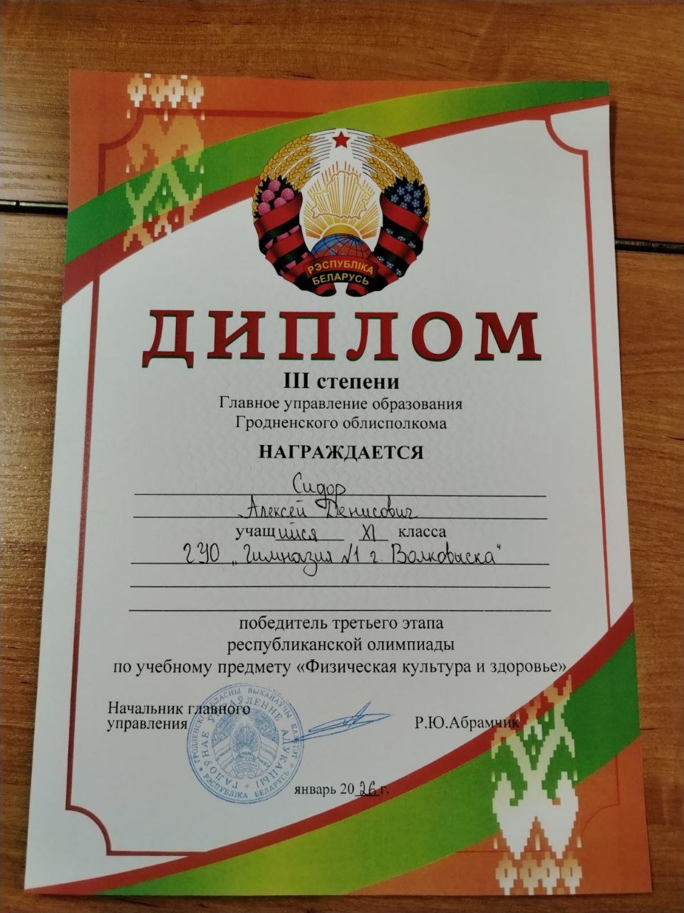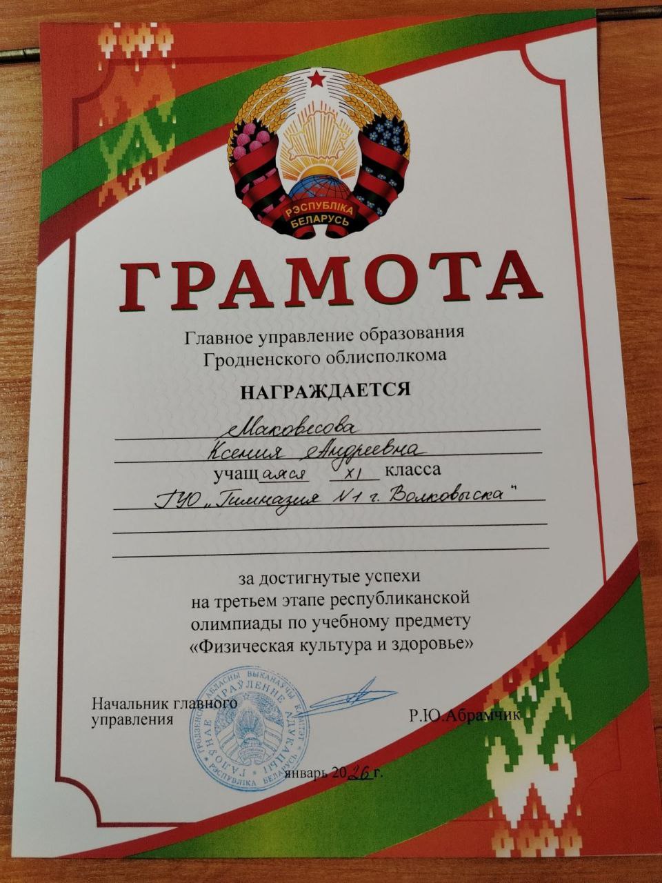 16 января подведены итоги по учебному предмету «Физическая культура и здоровья». Сидор Алексей Денисович отмечен Диплома III степени по учебному предмету, а Маковесова Ксения Андреевна награждена грамотой главного управления образования Гродненского обдисполкома за достигнутые успехи на третьем этапе республиканской олимпиады по учебному предмету «Физическая культура и здоровье».