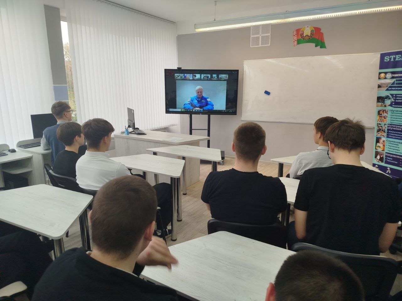 10 апреля 2026 года обучающиеся 10 «А» класса государственного учреждения образования «Гимназия №1 г. имени Т.А.Гриченка г.Волковыска» приняли участие в международном онлайн-уроке «Первые в космосе», на котором гостем стал летчик-космонавт, Герой России Олег Новицкий.